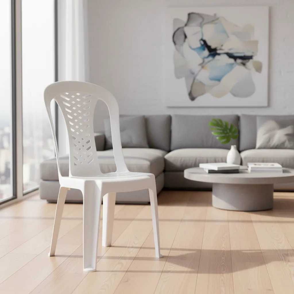 Silla monoblock de diseño estilizado sin apoyabrazos, fabricada en polipropileno de alta resistencia. Su estructura ligera y silueta delgada la hacen ideal para optimizar espacios en eventos masivos, banquetes o áreas de comedor reducidas.