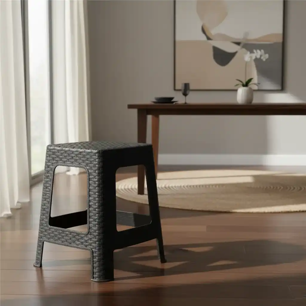Taburete cuadrado de baja altura fabricado por inyección de polímero de alta resistencia. Presenta un acabado texturizado que simula el tejido de ratán natural, combinando la belleza estética con la durabilidad y facilidad de limpieza del plástico.