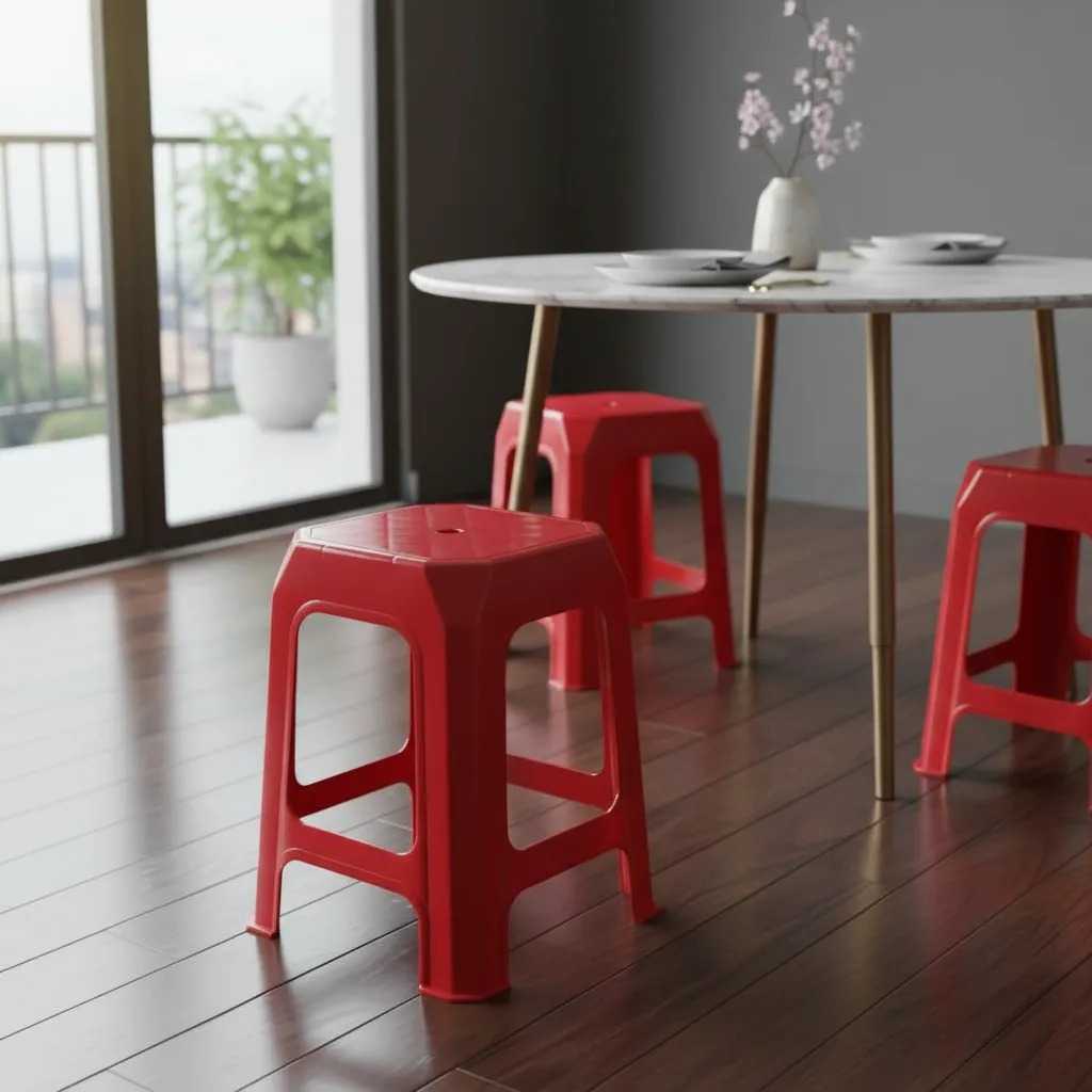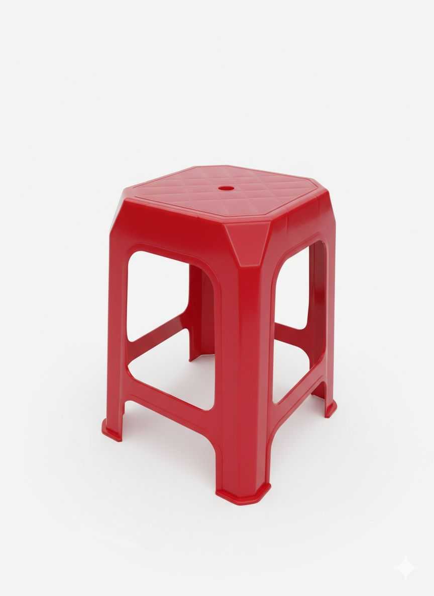 Taburete compacto de diseño minimalista fabricado en una sola pieza. Su estructura geométrica y acabado liso lo convierten en un elemento funcional, fácil de apilar y extremadamente sencillo de limpiar, ideal para uso intensivo en cualquier ambiente.
